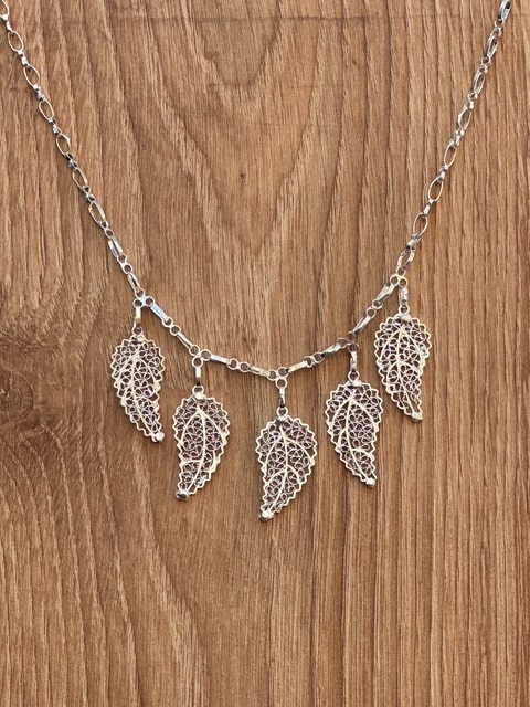 LAISSEZ LE VENT SOUFFLANT CES FEUILLES D'AUTOMNE EN ARGENT EMBELLIR VOTRE EXISTENCE AU TRAVERS DE CE COLLIER POUR FEMME FANTAISIE ETHNIQUE AUX INSPIRATIONS DES TECHNIQUES ETHNIQUE PRÉCOLOMBIENNE.