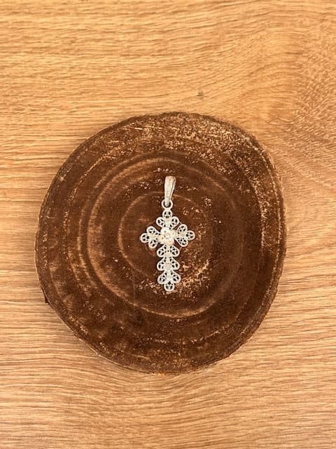 UN PEU DE FRAÎCHEUR APPORTÉE PAR CETTE CROIX EN ARGENT AUX INSPIRATIONS DES TECHNIQUES ETHNIQUES PRÉCOLOMBIENNES REPRÉSENTÉ PAR CE PENDENTIF. UN BIJOU ARTISANAL QUI RAVIRA LES FEMMES À LA RECHERCHE DE CE GENRE D'ACCESSOIRE UNIQUE.
